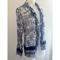 Attractive lightweight shirt with embellishment waist line, hem and sleeves. Striking combination of shades of blue/mauve/white.