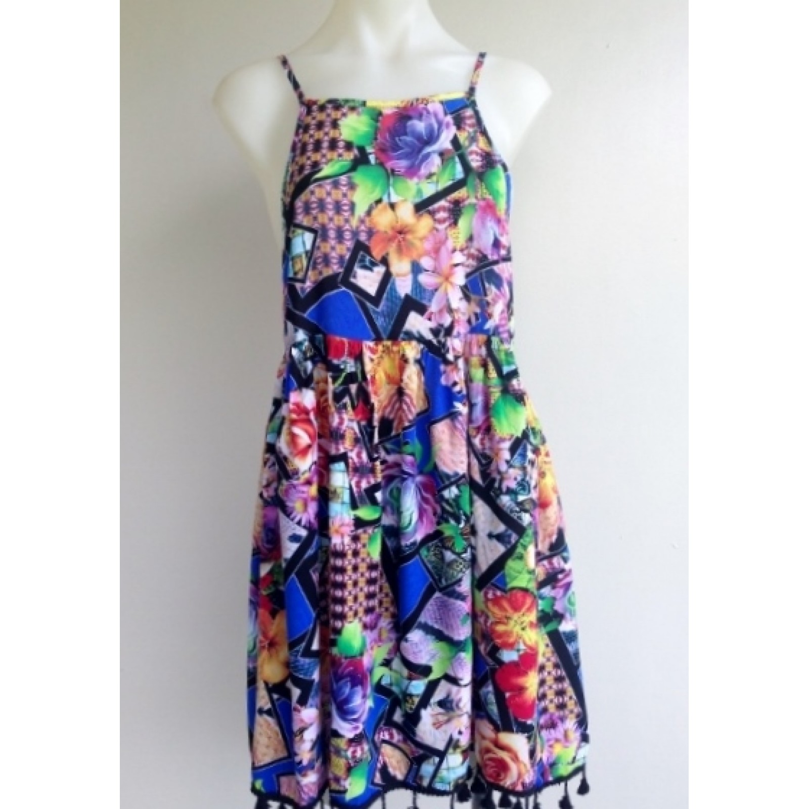 Striking multi-colourful floral and abstract design/pattern dress with embellished hem. 100% polyester.