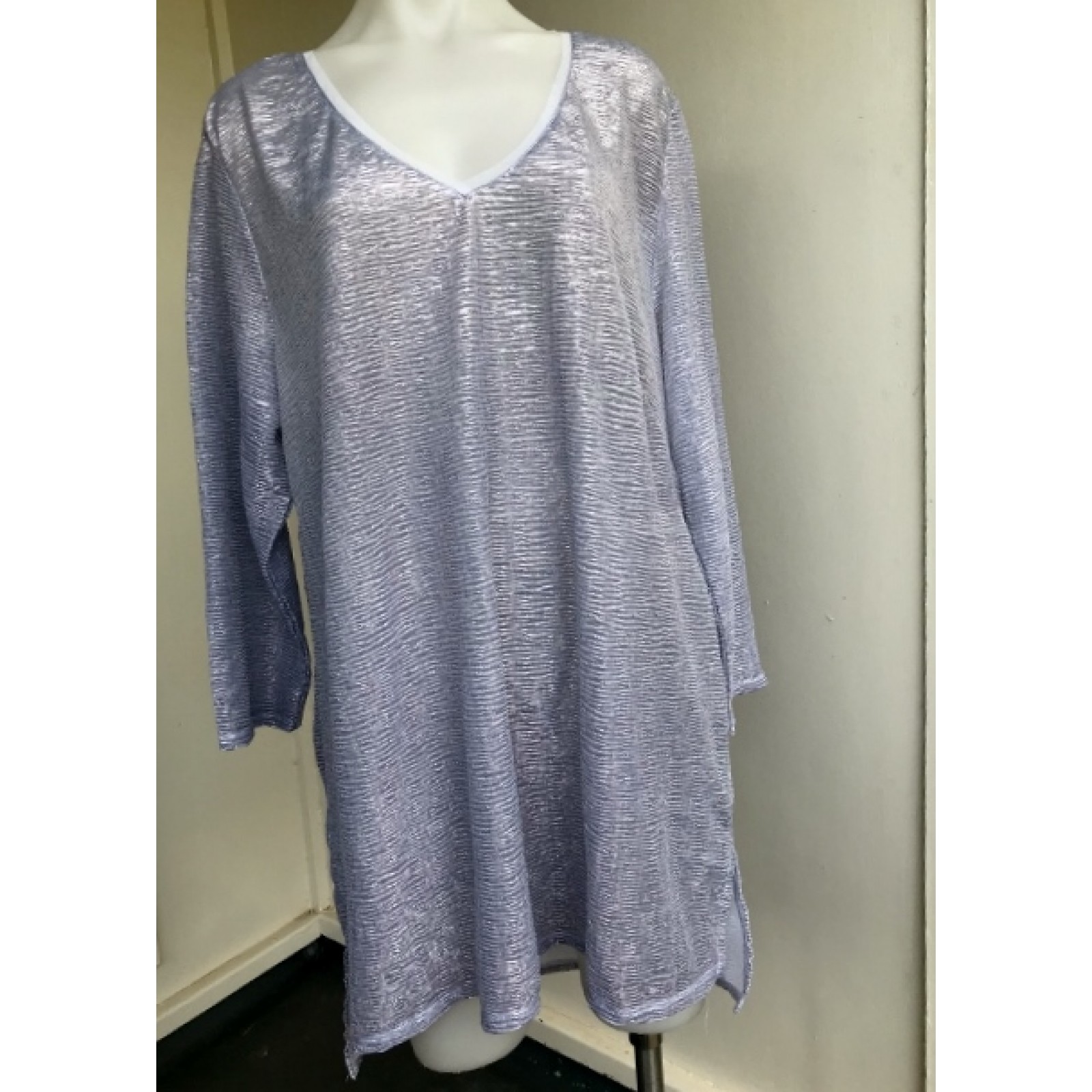 Lovely comfortable long sleeves top with embellished v-neck and side slits. 100% polyester. Shimmer will reduce slightly after wash.